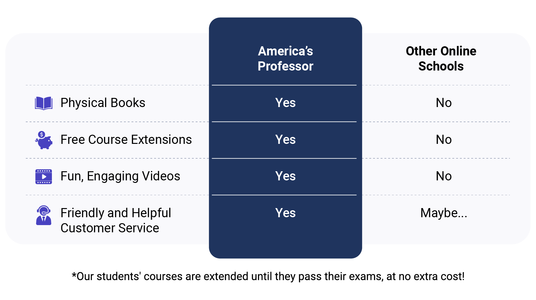 If you don’t pass your exam, please send us a copy of your fail report to info@americasprofessor.com. Our Content Specialists will gladly take a look at your score report and make recommendations on which chapters to study given your areas of weakness on the report. Please only send these reports in if you have completed your course 100%. We will not provide recommendations if you have not completed your course.