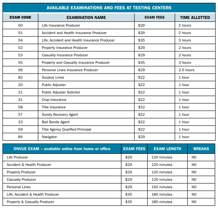 The cost is $29-$35 for an examination. You may take up to two exams for that fee (Life + Accident and Health or Property + Casualty). A retake of any portion is the same fee.