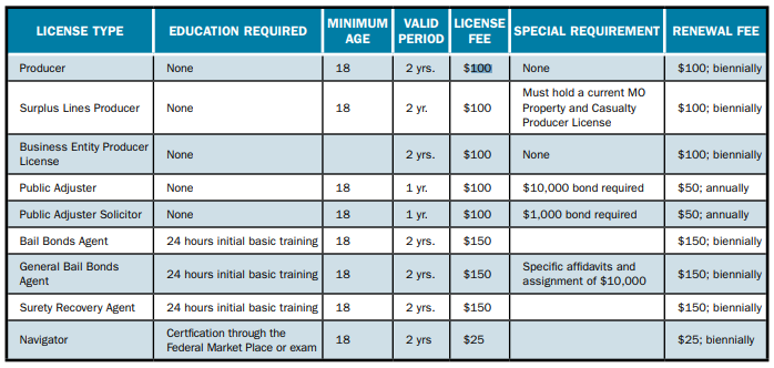 What insurance exams are given in Missouri and what do they cost?